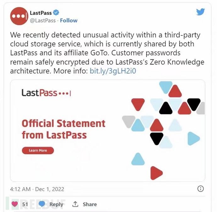 但是器L取客这个保证似乎并没有让客户满意。毕竟在2022年8月,认黑LastPass 还曾公开承认,客窃有黑客曾进入过 LastPass 的户数内部系统,并窃取了部分源代码和敏感数据。大事仅仅三个月后,LastPass 就在一次出现如此严重的数据泄露事件。 公开信息显示,LastPass是一个在线密码管理器和页面过滤器,采用了强大的企商汇加密算法,自动登录/云同步/跨平台/支持多款浏览器。该公司声称其产品有超过10万家企业、3300万人员正在使用,是全球最大的在线密码管理软件。 值得一提的是,11月发生的数据泄露事件和8月发生的源代码泄露存在关联,根据LastPass 首席执行官 Karim Toubba的说法,黑客利用了“8月事件中获得的信息" ,从而获得了对用户数据的访问。 LastPass 表示,目前公司已经聘请专业网络安全公司Mandiant调查此事件,并将此次攻击的情况和执法部门进行了汇报。 近几年,LastPass 频频传出数据、密码泄露丑闻。2021年年底,许多LastPass用户在收到LastPass登录电子邮件警告,香港云服务器邮件告知他们的主密码已被泄露,有人试图从未知位置登录他们的帐户。事后,LastPass 回应异常登录称,暂无证据表明数据泄露,但用户并不买账,并对LastPass的安全性提出了质疑。 Lastpass母公司GoTo也遭受影响 由于第三方云存储服务由LastPass及其母公司GoTo(原名LogMeIn)共享,因此此次攻击事件也影响了GoTo的开发环境和第三方云存储服务,并泄露了相应的数据。 GoTo表示,该攻击事件并未影响他们的产品和服务,并且它们仍然可以正常运行。为了更好地确保安全,GoTo公司称在袭击发生后部署了“增强的安全措施和监控能力”。 有国外媒体向 GoTo 询问事件发生的具体信息及相关后果,例如攻击发生的时间或源代码是否被盗,但尚未得到回复。IT技术网 参考来源https://www.bleepingcomputer.com/news/security/lastpass-says-hackers-accessed-customer-data-in-new-breach/ |