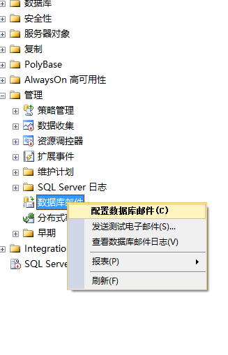 其他邮箱都是类似的,下面我们开始SQL Server数据库的中置学演示 图形化演示第一步:找到数据库【管理】下的【数据库邮件】,如下图:  图片