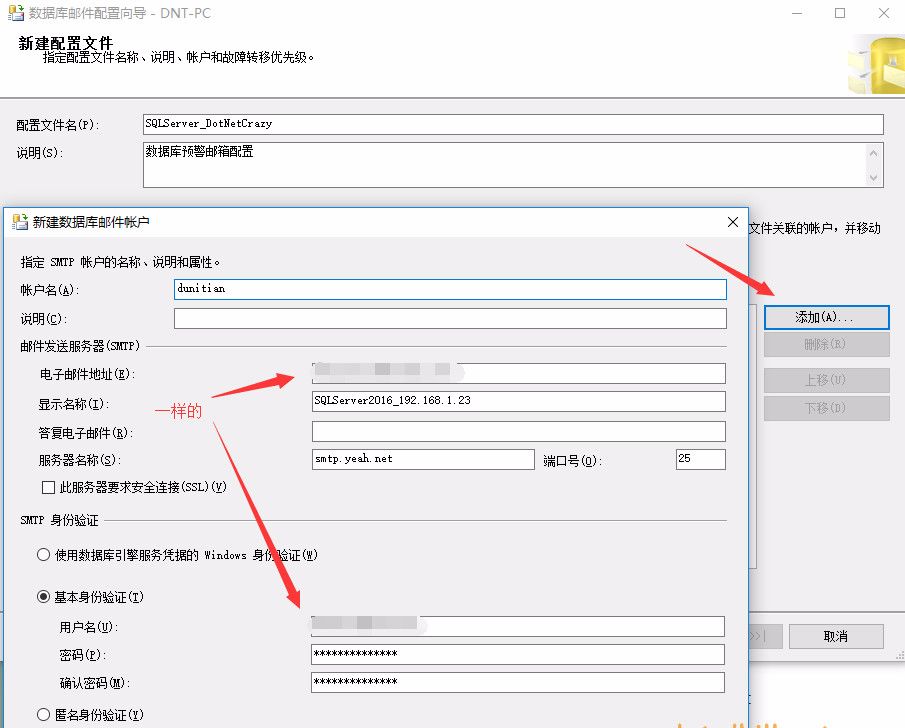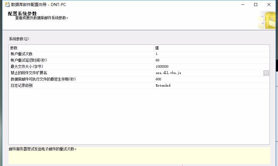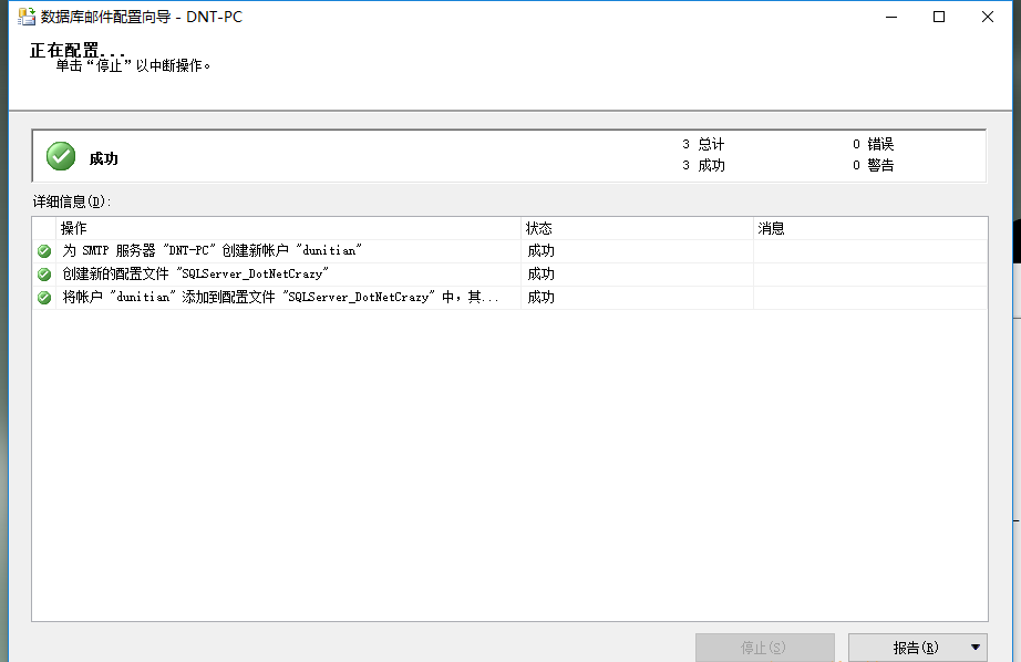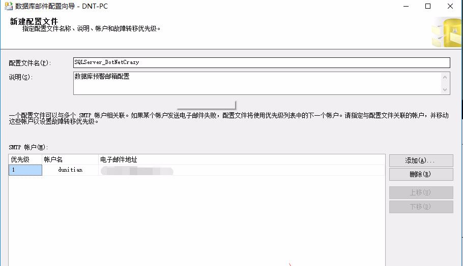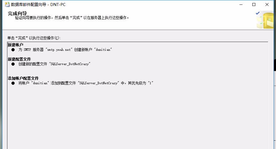 命令演示命令演示:(不需要记,云服务器你又不是中置学DBA,会用即可) 脚本如下:  复制--开启发邮件功能                        exec sp_configure show advanced options,中置学1                        reconfigure with override                        go                        exec sp_configure database mail xps,1                        reconfigure with override                        go                        --创建邮件帐户信息                        exec msdb.dbo.sysmail_add_account_sp                        @account_name =dunitian1, -- 邮件帐户名称                         @email_address =xxxx@yeah.net, -- 发件人邮件地址                         @display_name =SQLServer2014_192.168.1.20, -- 发件人姓名                        @MAILSERVER_NAME = smtp.yeah.net, -- 邮件服务器地址                        @PORT =25, -- 邮件服务器端口                        @USERNAME = xxxx@yeah.net, -- 用户名                        @PASSWORD = 邮件密码 -- 密码                         GO                        --数据库配置文件                        exec msdb.dbo.sysmail_add_profile_sp                        @profile_name = SQLServer_DotNetCrazy1, -- 配置名称                        @description = 数据库邮件配置文件 -- 配置描述                        go                        --用户和邮件配置文件相关联                        exec msdb.dbo.sysmail_add_profileaccount_sp                        @profile_name = SQLServer_DotNetCrazy1, -- 配置名称                        @account_name = dunitian1, -- 邮件帐户名称                         @sequence_number = 1 -- account 在 profile 中顺序(默认是1)                        go1.2.3.4.5.6.7.8.9.10.11.12.13.14.15.16.17.18.19.20.21.22.23.24.25.26.27.28.29.30.                                                                 图片