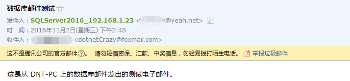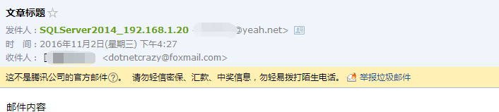 发送邮件脚本: 复制exec msdb.dbo.sp_send_dbmail                        @profile_name = SQLServer_DotNetCrazy1, --配置名称                        @recipients = dotnetcrazy@foxmail.com, --收件名称                        @body_format = HTML, --内容格式                        @subject = 文章标题,                        @body = 邮件内容1.2.3.4.5.6.                                                                结果:20的ip也发过来了  图片