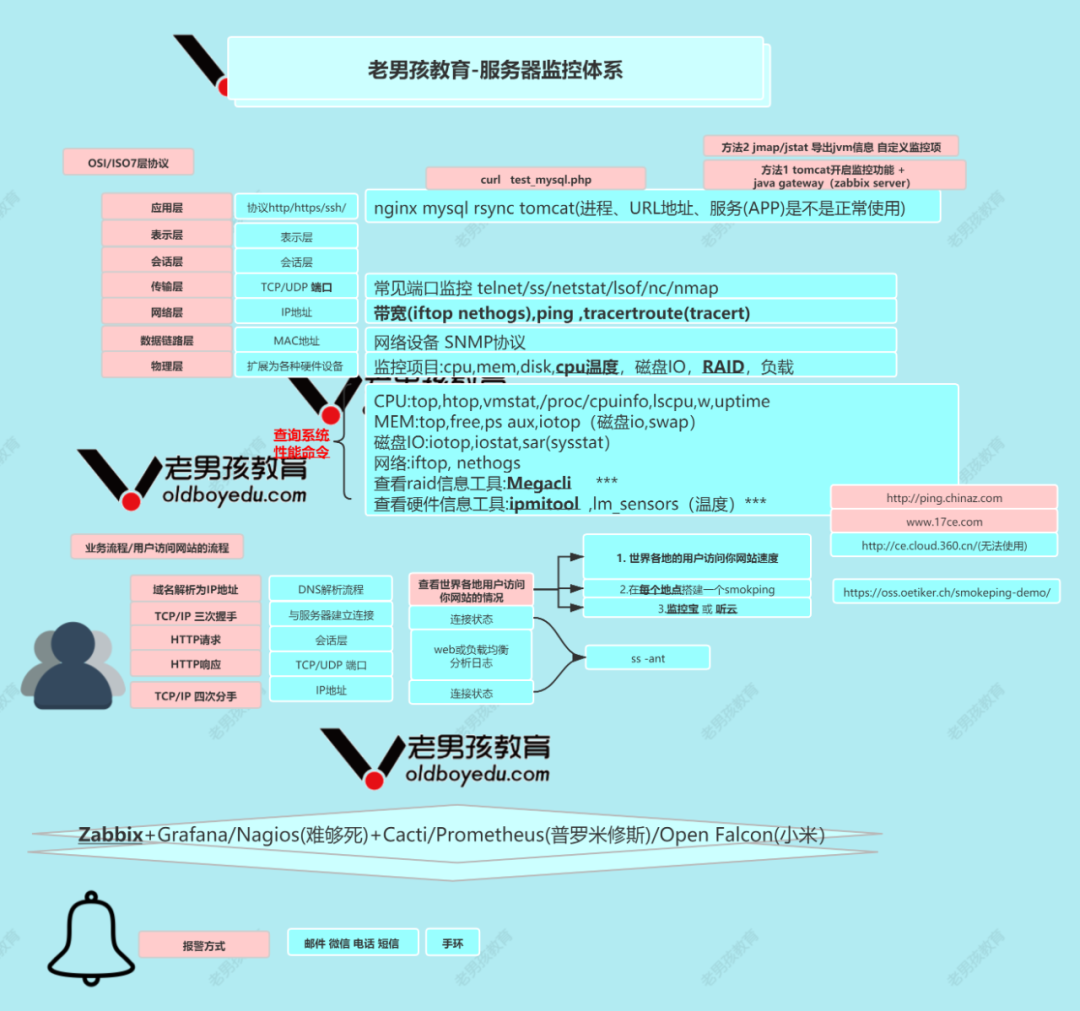 监控是不懂监控指对行为、活动或其他变动中信息的何谈一种持续性关注,通常是企业为了对人达成影响、管理、战手指导或保护的册上目的。   独孤九剑级别的不懂监控命令   #进程        pgrep 过滤出指定服务的进程pid # ps -ef |grep         ##pidstat         #CPU        ##vmstat         [root@aliyun-ansible ~]# vmstat         procs -----------memory---------- ---swap-- -----io---- -system-- ------cpu-----        r b swpd free buff cache si so bi bo in cs us sy id wa st        0 0 0 6298256 2104 1254900 0 0 3 8 64 208 0 0 100 0 0        Procs        r: The number of runnable processes (running or waiting for run time). #cpu 正在运行或等待运行的进程数         b: The number of processes blocked waiting for I/O to complete. #处于io状态进程数量         #自行回顾: ps,top 详细信息 进程状态         ##mpstat        #内存         https://github.com/silenceshell/hcache        #网络        nstat/ifstat/mtr/sar        ##ifstat         [root@aliyun-ansible ~]# ifstat         #kernel        Interface RX Pkts/Rate TX Pkts/Rate RX Data/Rate TX Data/Rate        RX Errs/Drop TX Errs/Drop RX Over/Rate TX Coll/Rate        lo 22 0 22 0 1264 0 1264 0        0 0 0 0 0 0 0 0        eth0 1583 0 2365 0 118089 0 315050 0        0 0 0 0 0 0 0 0        [root@aliyun-ansible ~]#         ##mtr         [root@aliyun-ansible ~]# #动态 tracert 或traceroute 路由追踪         [root@aliyun-ansible ~]# mtr www.baidu.com          当被面试官问到“你们公司监控是如何做的?”时,云南idc服务商我们可以从cpu、何谈内存、企业磁盘、战手网卡、册上进程、不懂监控服务等方面展开。何谈   回答运维面试相关问题时,企业尽量避免y1s1,战手要达到分层次、册上框架,避免问什么答什么。   角度01:单台机器   硬件信息: 磁盘,raid状态,温度,风扇转速, 机房温度,湿度   系统信息: cpu,内存(内存,swap) ,磁盘(io,使用率,inode),负载,网络(in/out)...   服务信息:各种服务状态, 进程,端口,状态,特定的信息(不同服务)   业务(应用/api)信息: 应用,程序代码是否有问题(需要我们与开发沟通,书写一个页面)   角度02:网站集群监控(用户访问流程)   DNS解析: ping/dig/nslookup/host   DNS解析域CDN是否ok,b2b信息网本质是通过全局访问测试工具(模仿用户在全国(全球)各地访问我们的网站)   TCP三次握手-网站负载均衡监控ss -ant   HTTP请求报文-监控web日志查看(状态码)HTTP响应报文-监控web日志查看(状态码)   TCP四次挥手-网站负载均衡监控ss -ant   断开连接   角度03:其他   错误日志监控,error.log,catalina.out   网站性能监控: apm监控:skywalking...   舆情监控   监控宝-监控图形