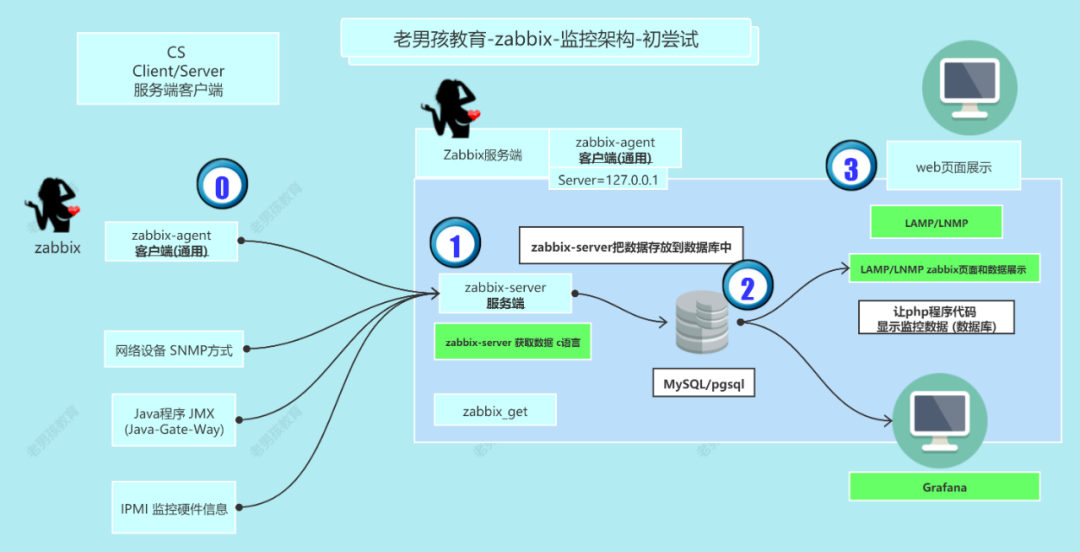 Zabbix监控架构   Zabbix是一个CS(服务端/客户端)架构的服务。   Zabbix-Agent获取数据 -发送给->Zabbix-Server服务端-数据会被存放-数据库<-Zabbix Web页面展示数据。