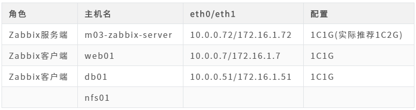 数据库 [root@m03 ~]# yum install -y mariadb-server         [root@m03 ~]# mysql_secure_installation         NOTE: RUNNING ALL PARTS OF THIS SCRIPT IS RECOMMENDED FOR ALL MariaDB        SERVERS IN PRODUCTION USE! PLEASE READ EACH STEP CAREFULLY!        In order to log into MariaDB to secure it, well need the current        password for the root user. If youve just installed MariaDB, and        you havent set the root password yet, the password will be blank,        so you should just press enter here.        Enter current password for root (enter for none):        OK, successfully used password, moving on...        Setting the root password ensures that nobody can log into the MariaDB        root user without the proper authorisation.        Set root password? [Y/n] Y        New password:        Re-enter new password:        Password updated successfully!        Reloading privilege tables..        ... Success!        By default, a MariaDB installation has an anonymous user, allowing anyone        to log into MariaDB without having to have a user account created for        them. This is intended only for testing, and to make the installation        go a bit smoother. You should remove them before moving into a        production environment.        Remove anonymous users? [Y/n] Y        ... Success!        Normally, root should only be allowed to connect from localhost. This        ensures that someone cannot guess at the root password from the network.        Disallow root login remotely? [Y/n] Y        ........        By default, MariaDB comes with a database named test that anyone can        access. This is also intended only for testing, and should be removed        before moving into a production environment.        Remove test database and access to it? [Y/n] Y        - Dropping test database...        ... Success!        - Removing privileges on test database...        ... Success!        Reloading the privilege tables will ensure that all changes made so far        will take effect immediately.        Reload privilege tables now? [Y/n] Y        ... Success!        Cleaning up...        All done! If youve completed all of the above steps, your MariaDB        installation should now be secure.        Thanks for using MariaDB!        MariaDB [(none)]> select user,host from mysql.user ;        +------+-----------+        | user | host |        +------+-----------+        | root | 127.0.0.1 |        | root | ::1 |        | root | localhost |        | root | m03 |        +------+-----------+        4 rows in set (0.00 sec)        MariaDB [(none)]> show databases;        MariaDB [(none)]> show databases;        +--------------------+        | Database |        +--------------------+        | information_schema |        | mysql |        | performance_schema |        +--------------------+        3 rows in set (0.00 sec)        MariaDB [(none)]>        create database zabbix charset utf8 collate utf8_bin;        grant all on zabbix.* to zabbix@localhost identified by 1 ;        grant all on zabbix.* to zabbix@172.16.1.% identified by 1 ;        MariaDB [(none)]> show databases;        MariaDB [(none)]> select user,host from mysql.user;        +--------+------------+        | user | host |        +--------+------------+        | root | 127.0.0.1 |        | zabbix | 172.16.1.% |        | root | ::1 |        | root | localhost |        | zabbix | localhost |        +--------+------------+        5 rows in set (0.00 sec)        cat mysqli.php        <?php        //$link_id=mysqli_connect(主机名,用户,密码);        $link_id=mysqli_connect(localhost,zabbix,1) or        mysqli_error();        if($link_id){        echo "mysql successful by oldboy !";        }else{        echo mysqli_error();        }        //这是php单行注释        ?>