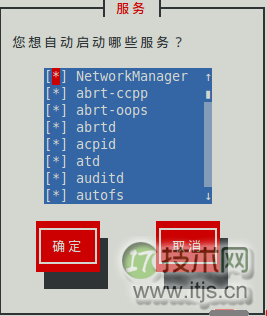 上面我们先将sshd服务的所有启动级别关闭,然后使用--level选项启动自定义级别 Tips:--list选项可查看指定服务的启动状态,chkconfig不带任何选项则查看所有服务状态 第三种方式:ntsysv 伪图形 ntsysv和chkconfig其实是一样的,只不过加上了图形而已 启动ntsysv有两种方式,一是直接在命令行中输入ntsysv,二是使用setup命令,然后选择系统服务
