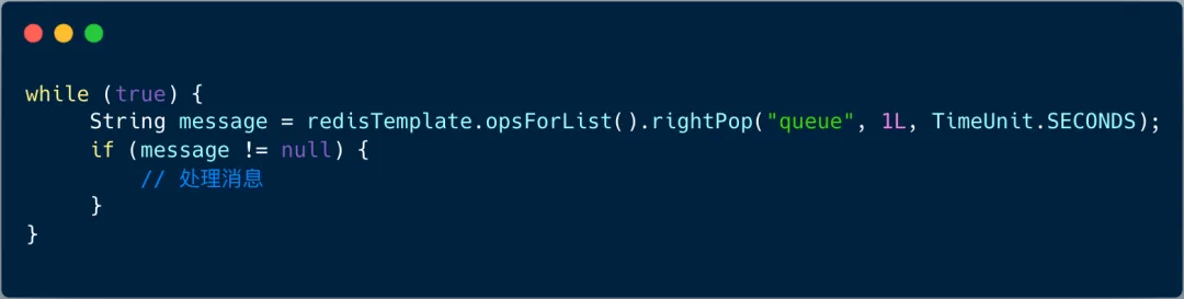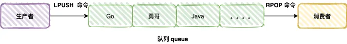 接下来,程模我们可以通过 spring-data-redis API 演示生产消费流程: 生产者 复制redisTemplate.opsForList().leftPush("queue" , "Java"); redisTemplate.opsForList().leftPush("queue" , "勇哥"); redisTemplate.opsForList().leftPush("queue" , "Go");1.2.3. 消费者我们启动一个独立的线程从队列中读取消息(RPOP 命令),读取成功之后,消费消息,若没有消息,则休眠一会,下一次循环再继续。 图片