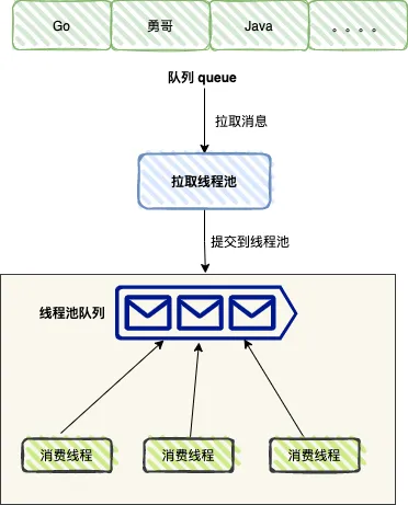 如图,我们启动一个消费线程永动机,消费线程拉取消息后,执行消费逻辑。 这种消费者线程模型非常容易理解,同时也非常适合顺序消费的模式。同时,假如我们在消费消息时,服务器托管服务器宕机或者断电,可能丢失一条消息。 接下来,我们想一想,有没有消费速度更高的消费模型吗?笔者根据过往的经历,列举三种模式: 拉取线程 + 消费线程池(非阻塞模式)拉取线程 + 消费线程池 (阻塞模式)拉取线程 + Disruptor(阻塞模式)二、拉取线程 + 消费线程池(非阻塞模式)为了提升消费速度,我们可以将拉取和消费拆分成两种动作,分别通过不同的线程池来处理。拉取线程池负责拉取消息,消费线程池负责消费消息。 图片