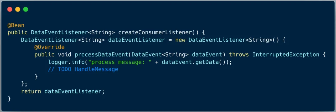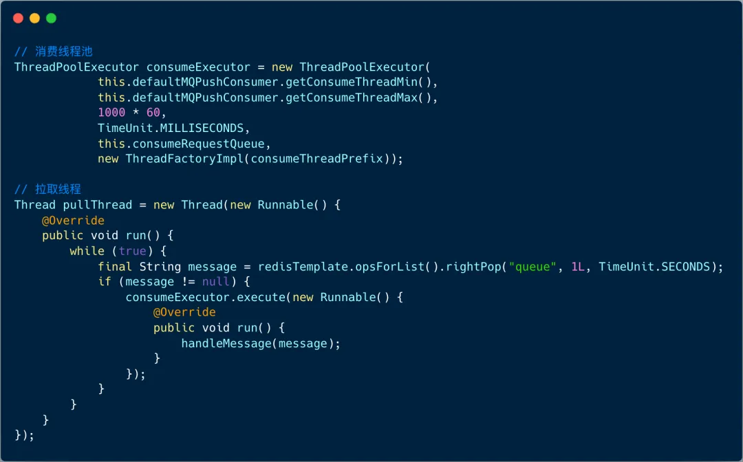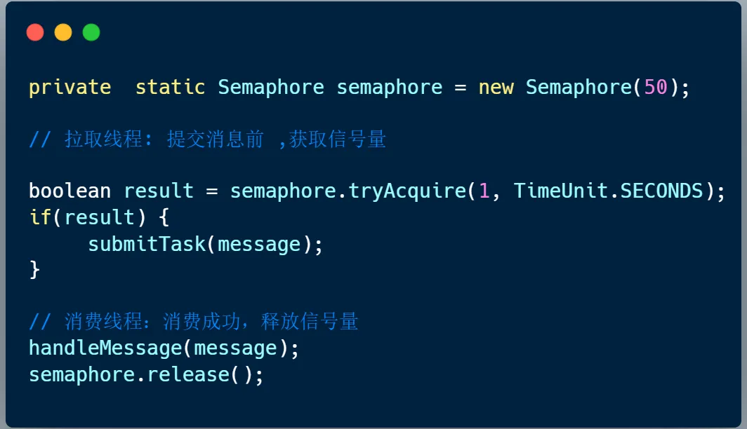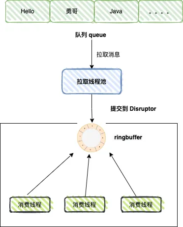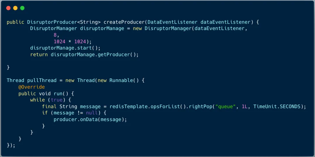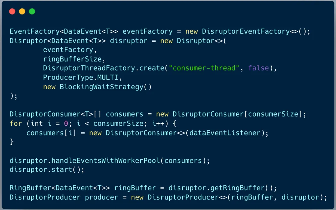 和线程池机制非常类似, Disruptor 也是非常典型的生产者/消费者模式。线程池存储提交任务的容器是阻塞队列,而 Disruptor 使用的是环形缓冲区 RingBuffer。 环形缓冲区的设计相比阻塞队列有如下优点: 环形数组结构为了避免垃圾回收,采用数组而非链表。同时,数组对处理器的缓存机制更加友好。 元素位置定位数组长度 2^n,通过位运算,加快定位的速度。下标采取递增的形式,不用担心 index 溢出的问题。index 是 long 类型,即使100万QPS的处理速度,也需要30万年才能用完。 无锁设计每个生产者或者消费者线程,会先申请可以操作的元素在数组中的位置,申请到之后,直接在该位置写入或者读取数据。 此刻大家并不需要理解环形缓冲区的读写机制,只需要明白 环形缓冲区 RingBuffer 是 Disruptor 的精髓即可。 将消费线程池替换成 Disruptor 有两个明显的优点: 无锁队列,写入读取性能非常好当拉取线程提交消息到 Disruptor 时,若环形缓冲区 RingBuffer 已经满了,则拉取线程会阻塞,这样天然的可以避免无限拉取,同时避免 OOM 的问题。伪代码类似: 1.定义 Disruptor 图片 2.拉取线程将消息发送到 Disruptor Ringbuffer 图片 3.消费消息 图片