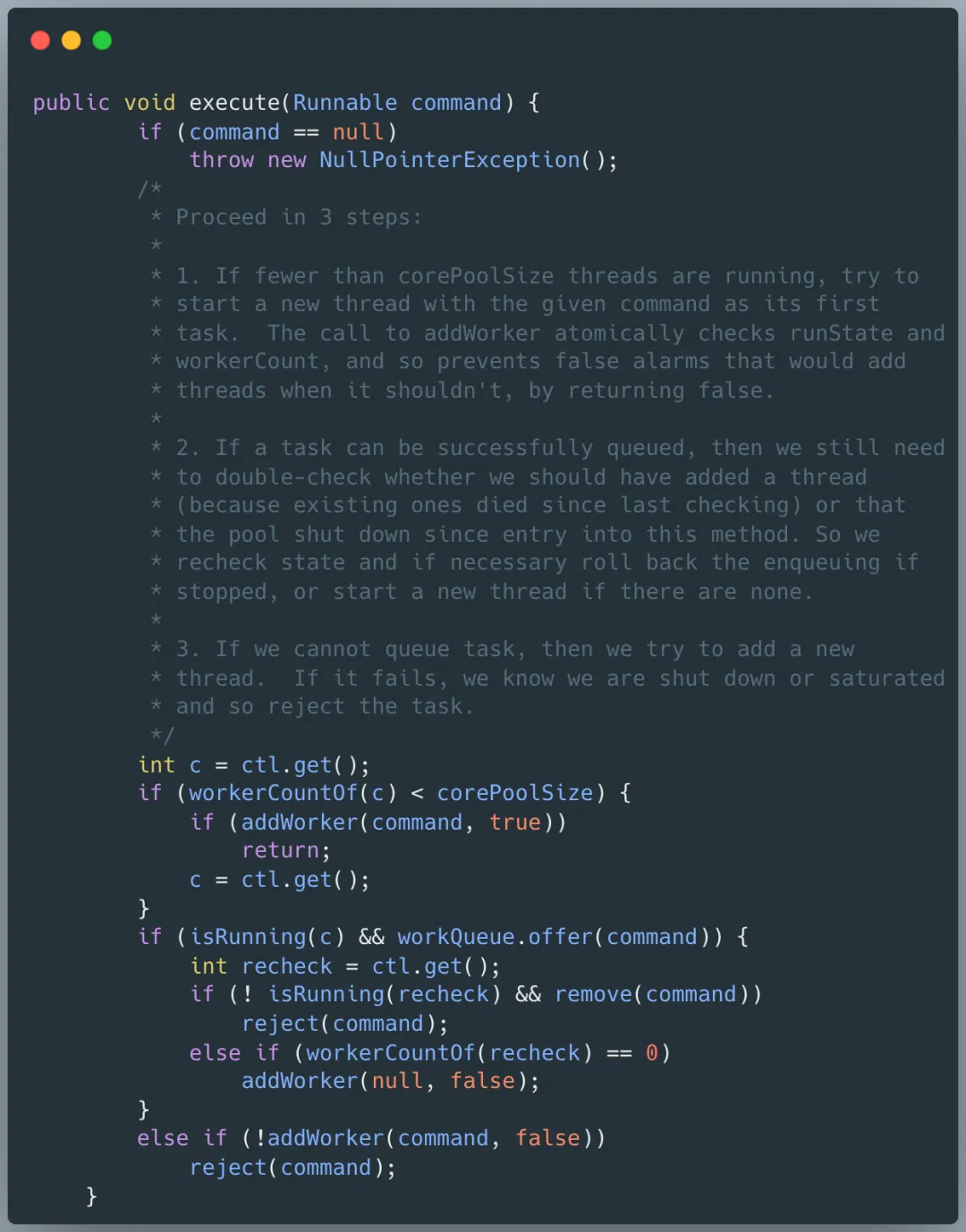 可以看到,第 30 行调用的是 workQueue 的非阻塞的 offer 方法。 如果队列已满,新提交的任务并不会被 block 住,反而会调用后续的 reject 流程。 如果我们想要达到阻塞生产者的目的的话,可以采取如下的两种方案: 信号量限制同时进入线程池等待队列的任务数 。 图片 使用线程池的拒绝机制,把新加入的任务 put 到等待队列里,这样也可以阻塞住生产者。 图片