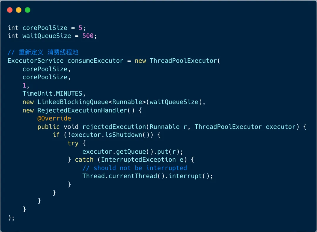 如图,在拉取线程内部,我们拉取完消息后,将消息提交到消费线程 consumeExecutor 。 这样方式可以通过多线程执行大幅度提升消费速度 ,但是这里还是有一个问题: 假如消费速度很慢,生产者速度很高,那么就会在线程池内容易产生消息堆积,这里面会产生两个隐形风险: 线程池队列无限堆积,则可能有 OOM 的风险 ;假如消费者服务器宕机或者断电,那么会丢失大量的消息。那么如何优化这种模式呢 ? 答案是:拉取线程提交消息到线程池时,当队列中消息数量到达一定数量时,提交消息到线程池会阻塞。亿华云 三、拉取线程 + 消费线程池(阻塞模式)我们将消息包装为 Runnable ,然后通过消费线程池执行 execute ,拉取线程会不会阻塞呢 ? 下图是执行的源码: 图片
