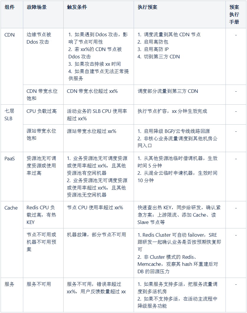 上述保障能力是我们保障体系中核心的部分能力,完整能力不再展开描述。SRE也会跟业务研发团队盘点业务架构的上技术保障能力有哪些,这里不再展开描述。 SRE通过对上述技术保障能力的梳理,可以很清晰的知道目前我们有什么能力来保障活动的稳定性。SRE盘点完这些技术保障方案后,对SRE本身的能力也是一个全方位的提升。 七、预案能力如果活动中出现了异常或者故障,SRE或业务研发团队该如何选择对应的技术保障能力,或者如何应急处理呢?预案能力的提前盘点也非常重要。预案是侧重于已经发生问题时快速止损的能力。技术保障能力和预案能力的区别是:前者侧重于问题发生前,后者侧重于问题发生后。下面列出SRE在活动保障中关注的部分重要故障预案。