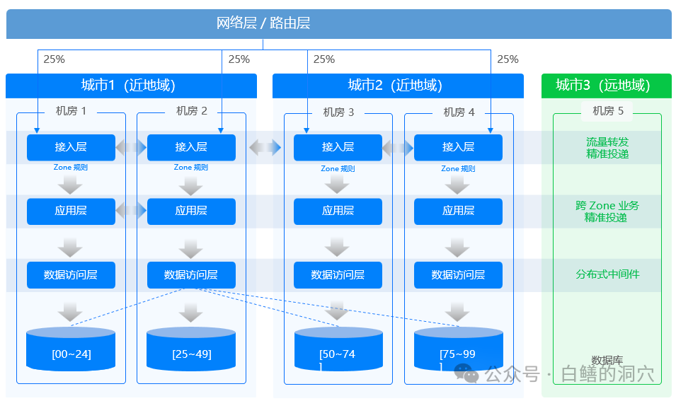 对于分布式数据库而言,其高可用解决方案则更为丰富,不过其建设成本也更高。我们以OceanBase为例,面对金融机构的业务连续性要求,在一套OceanBase分布式数据库集群中构建三地五中心的高可用架构。选择两个近地域,网络延时较低的城市的四个机房构建出四个业务ZONE,每个ZONE可以承担1/4的业务负载。而在较远地域的亿华云城市3建设第五个ZONE,如果你使用了4.X版本,第五个机房可以只放置日志,而不需要数据文件,从而节约成本。当然为了确保业务的性能,近地域机房之间的网络延时越低越好,最好能够低于2毫秒。 图片