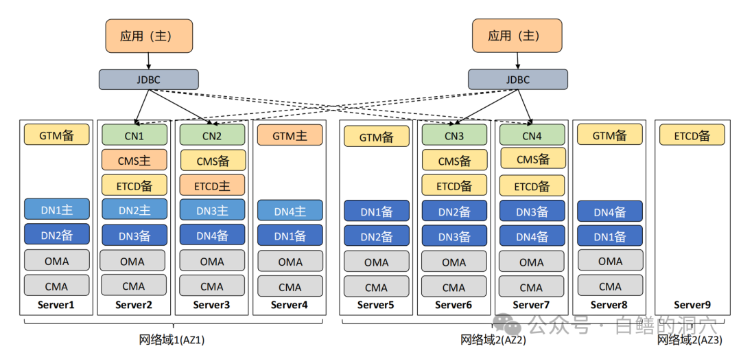GaussDB也有类似的解决方案,上面是一个同城三中心双活的解决方案,AZ1/AZ2的8台服务器承担核心业务,可以通过全局负载均衡实现双活,AZ3只参与仲裁,因此在Server9上只部署了一个ETCD备实例。 图片