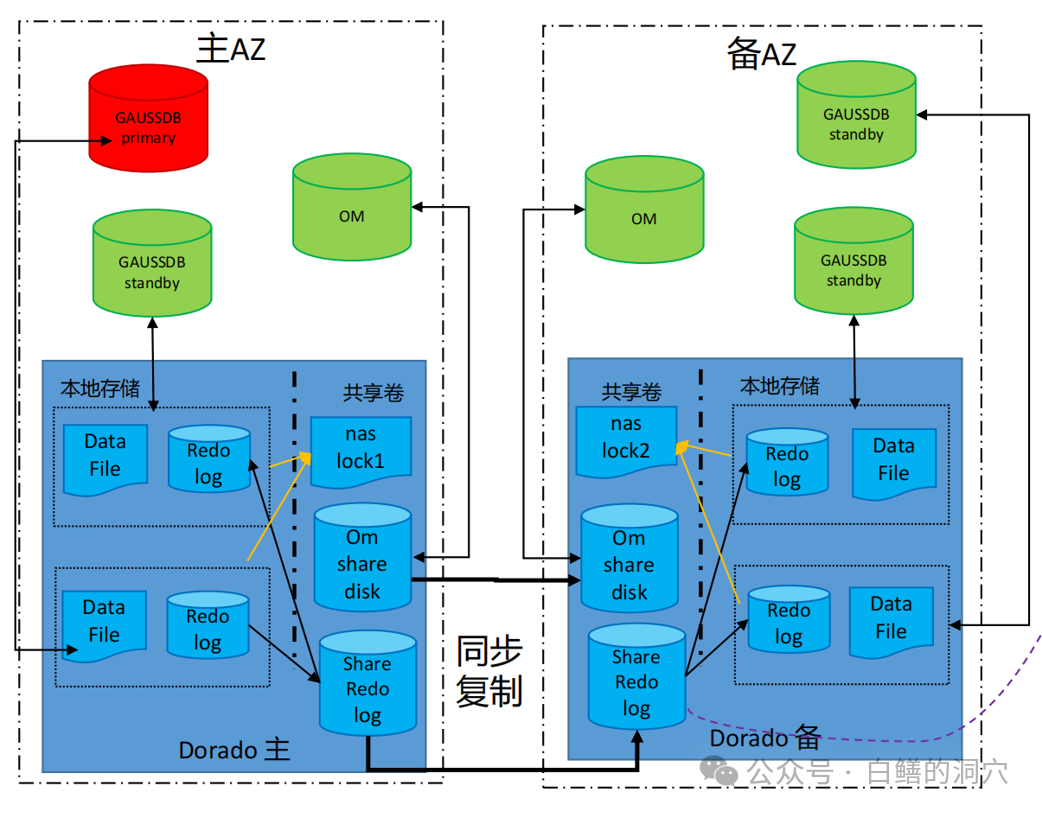GaussDB在一些金融行业用户侧主推了一个基于Dorado双集群的高可用解决方案。采用的是GaussDB集中式部署模式,主库的Redo Log会写一份Shared Redo Log,这个Redo Log被Dorado同步复制到远程的另外一个Dorado集中式存储中,因此备AZ的GaussDB Standby数据库是零数据丢失的。这个和当年我们在Oracle ADG上实现零数据丢失的方案是一模一样的。 |