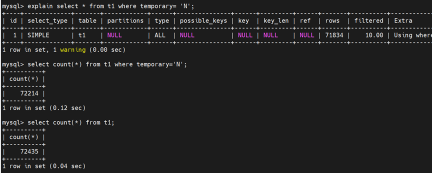 从上图可以看出,优化器按规则估算过滤比例,filtered为10%,也就是估算返回行数为rows * filtered/100=7183行,而实际返回行数为72214,filtered=72214/72435=99.69。这个差异可谓很大了。 收集一下该列上直方图的统计信息后,再去查看执行计划中的filtered,此时filtered就相当精确了。