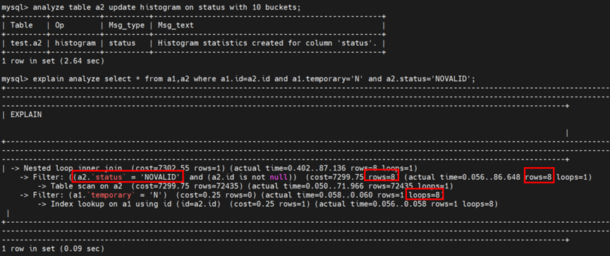 从上图可以看出,有了直方图后,优化器选择了a2驱动a1, a2表过滤后估算的行数为8,实际也为8,a1作为被驱动表只扫描了8次。执行总耗时87ms,效率提升了3倍。 体会到直方图的作用了吗,直方图告诉了优化器数据分布,让优化器估算更准确,进而让优化器做出了英明的决策。  |