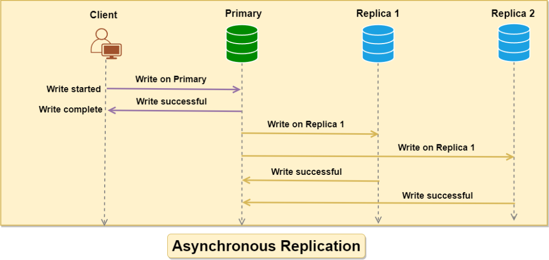 (2)工作原理 主节点操作:想象一下船长下达命令。船长(或主节点)负责,当需要做一些事情时,他们确保每个人都知道。在同步复制中,主节点就像船长,指导数据更新的方式。它是启动流程并确保一切顺利进行的人。副本操作:船上的机组成员就像同步复制中的副本。他们遵循船长的命令,确保一切都做得很好。当主节点要求更新数据时,副本立即执行。他们一起工作,确保每个数据的副本都完全相同。确认过程:一旦机组完成了船长的命令,他们会回报,通知船长工作已经完成。在同步复制中,副本向主节点发送确认。这就像竖起大拇指,表示“一切都很好!”这确保一切同步,并流程完成。(3) 优缺点 容错性:同步复制就像汽车备胎。如果出了问题,您有备用方案可供使用。由于所有数据的副本都相同,如果一部分出现故障,其他副本可以接管。这是确保系统始终可靠和随时准备好的一种方式。可能的阻塞问题:但是,如果您每次使用备胎都需要请求许可并等待答复怎么办?这可能会减慢您的速度。在同步复制中,等待所有确认有时可能会导致延迟。这就像等待绿灯,确保安全,但可能会稍微减慢速度。6.异步复制(1) 定义和概述 异步复制就像给朋友寄明信片。您写下消息,投入邮箱,然后继续您的日常生活。您不等待朋友何时阅读它。在计算机术语中,异步复制意味着在一个地方更新数据,然后将更新发送到其他地方,而无需等待确认它们是否已到达。这是一种快速推进事务的方式,即使这意味着冒一些风险。