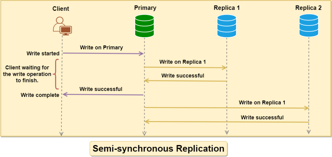 (2) 工作原理 立即响应客户:在异步复制中,系统接受您的请求,然后告诉您“明白了!”并允许您继续。它不会让您等待看到一切发生。这一切都是关于速度和便利。异步传播到副本:在您将明信片投入邮箱后,由邮递员将其送到目的地。您相信它最终会到达。在异步复制中,更新发送到系统的其他部分(即副本),它们会在能够时赶上。这就像发出派对的邀请函。您发送它们,相信每个人都会得到消息。(3) 优缺点 最大化吞吐量:异步复制就像一个快速移动的传送带。它以快速的速度移动,而不会停下来检查每个小细节。对于需要同时处理大量请求的系统来说,这非常适合。一切都是关于尽快完成工作,即使这意味着冒一些风险。可能发生数据丢失:但如果您的明信片在邮寄途中丢失了怎么办?在异步复制中,存在某些更新可能会丢失或延迟的风险。这就像在不保存进度的情况下玩游戏。大多数时候,都没问题,但有时您可能希望更加小心。7.半同步复制(1) 定义和概述 半同步复制就像接力赛。一名跑步者将接力棒传递给下一名,他们都确保接力是安全的,然后第一名跑步者停下来。在计算机术语中,半同步复制是我们讨论过的其他两种方法的混合。它确保一些更新是安全的,但不是所有的。这是一种平衡的方法,就像走钢丝一样。它旨在在两者之间获得最好的效果。