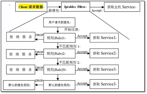 iptables执行过程   防火墙是层层过滤的,实际是按照配置规则的顺序从上到下,从前到后进行过滤的。   如果匹配成功规则,即明确表示是拒绝(DROP)还是接收(ACCEPT),数据包就不再向下匹配新的规则。   如果规则中没有明确表明是阻止还是通过的,IT技术网也就是没有匹配规则,向下进行匹配,直到匹配默认规则得到明确的阻止还是通过。   防火墙的默认规则是所有规则都匹配完才会匹配的。