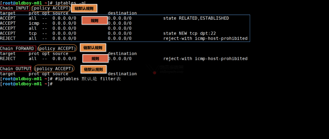 环境准备及命令   iptables启动或关闭的命令 m01 10.0.0.61 172.16.1.61        web01 10.0.0.7 172.16.1.7        web02 10.0.0.8 172.16.1.8        yum install -y iptables-services        [root@oldboy-m01 ~]# uname -r         3.10.0-862.el7.x86_64        [root@oldboy-m01 ~]# yum install -y iptables-services         [root@m01 ~]# rpm -ql iptables-services         /etc/sysconfig/ip6tables        /etc/sysconfig/iptables #防火墙的配置文件         /usr/lib/systemd/system/ip6tables.service        /usr/lib/systemd/system/iptables.service #防火墙服务配置文件(命令) systemctl start iptables         [root@m01 ~]# rpm -ql iptables         /usr/sbin/iptables #iptables 命令 添加/删除/查看 规则(4表伍链)        /usr/sbin/iptables-save #iptables规则 输出(保存)        /usr/sbin/iptables-restore # 恢复        #防火墙相关模块 加载到内核中        #写入到开机自启动.        modprobe ip_tables        modprobe iptable_filter        modprobe iptable_nat        modprobe ip_conntrack        modprobe ip_conntrack_ftp        modprobe ip_nat_ftp        modprobe ipt_state        #永久         cat >>/etc/rc.local<<EOF        modprobe ip_tables        modprobe iptable_filter        modprobe iptable_nat        modprobe ip_conntrack        modprobe ip_conntrack_ftp        modprobe ip_nat_ftp        modprobe ipt_state        EOF        [root@m01 ~]# lsmod |egrep filter|nat|ipt        nf_nat_ftp 12770 0        nf_conntrack_ftp 18638 1 nf_nat_ftp        iptable_nat 12875 0        nf_nat_ipv4 14115 1 iptable_nat        nf_nat 26787 2 nf_nat_ftp,nf_nat_ipv4        nf_conntrack 133053 6 nf_nat_ftp,nf_nat,xt_state,nf_nat_ipv4,nf_conntrack_ftp,nf_conntrack_ipv4        iptable_filter 12810 0        ip_tables 27126 2 iptable_filter,iptable_nat        libcrc32c 12644 3 xfs,nf_nat,nf_conntrack        [root@m01 ~]# systemctl stop firewalld         [root@m01 ~]# systemctl disable firewalld         [root@m01 ~]# systemctl start iptables.service         [root@m01 ~]# systemctl enable iptables.service         Created symlink from /etc/systemd/system/basic.target.wants/iptables.service to /usr/lib/systemd/system/iptables.service.        [root@m01 ~]# systemctl status iptables.service         ● iptables.service - IPv4 firewall with iptables        Loaded: loaded (/usr/lib/systemd/system/iptables.service; enabled; vendor preset: disabled)        Active: active (exited) since Fri 2021-05-28 09:59:53 CST; 5s ago        Process: 7971 ExecStart=/usr/libexec/iptables/iptables.init start (code=exited, status=0/SUCCESS)        Main PID: 7971 (code=exited, status=0/SUCCESS)        May 28 09:59:53 m01 systemd[1]: Starting IPv4 firewall with iptables...        May 28 09:59:53 m01 iptables.init[7971]: iptables: Applying firewall rules: [ OK ]        May 28 09:59:53 m01 systemd[1]: Started IPv4 firewall with iptables        #查看filter表中的规则 ,默认查看的是filter表         [root@m01 ~]# iptables -nL        Chain INPUT (policy ACCEPT)        target prot opt source destination        ACCEPT all -- 0.0.0.0/0 0.0.0.0/0 state RELATED,ESTABLISHED        ACCEPT icmp -- 0.0.0.0/0 0.0.0.0/0        ACCEPT all -- 0.0.0.0/0 0.0.0.0/0        ACCEPT tcp -- 0.0.0.0/0 0.0.0.0/0 state NEW tcp dpt:22        REJECT all -- 0.0.0.0/0 0.0.0.0/0 reject-with icmp-host-prohibited        Chain FORWARD (policy ACCEPT)        target prot opt source destination        REJECT all -- 0.0.0.0/0 0.0.0.0/0 reject-with icmp-host-prohibited        Chain OUTPUT (policy ACCEPT)        target prot opt source destination        #查看指定表中的规则        [root@m01 ~]# iptables -t nat -nL         Chain PREROUTING (policy ACCEPT)        target prot opt source destination        Chain INPUT (policy ACCEPT)        target prot opt source destination        Chain OUTPUT (policy ACCEPT)        target prot opt source destination        Chain POSTROUTING (policy ACCEPT)        target prot opt source destination
