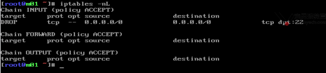 配置filter表规则   在正式配置前,先备份,清空规则 [root@m01 ~]# iptables -F         [root@m01 ~]# iptables -X        [root@m01 ~]# iptables -Z        [root@m01 ~]# iptables -nL         Chain INPUT (policy ACCEPT)        target prot opt source destination        Chain FORWARD (policy ACCEPT)        target prot opt source destination        Chain OUTPUT (policy ACCEPT)        target prot opt source destination          禁止访问22端口 #拒绝用户访问22端口         iptables -t filter -A INPUT -p tcp --dport 22 -j DROP        #查看规则并加上序号        iptables -t filter -nL --line-number        #删除规则        iptables -t filter -D INPUT 1 #根据序号删除          删除规则-D