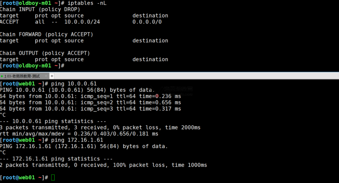 只允许指定网段连入(允许172.16.1.0网段) #方法1: 利用 ! 进行排除         iptables -I INPUT ! -s 172.16.1.0/24 -j DROP        #只准许 10.0.0.0/24 访问 言外之意 除了 10.0.0.0/24 都拒绝         iptables -I INPUT ! -s 10.0.0.0/24 -j DROP          #方法2: 修改链默认规则 修改为拒绝 添加准许        先配置好规则 准许规则        修改默认规则        [root@oldboy-m01 ~]# iptables -nL        Chain INPUT (policy ACCEPT)        target prot opt source destination        Chain FORWARD (policy ACCEPT)        target prot opt source destination        Chain OUTPUT (policy ACCEPT)        target prot opt source destination        [root@oldboy-m01 ~]# iptables -A INPUT -s 10.0.0.0/24 -j ACCEPT         [root@oldboy-m01 ~]# iptables -nL        Chain INPUT (policy ACCEPT)        target prot opt source destination        ACCEPT all -- 10.0.0.0/24 0.0.0.0/0        Chain FORWARD (policy ACCEPT)        target prot opt source destination        Chain OUTPUT (policy ACCEPT)        target prot opt source destination        [root@oldboy-m01 ~]# iptables -P INPUT DROP #修改默认规则         [root@oldboy-m01 ~]# iptables -nL        Chain INPUT (policy DROP)        target prot opt source destination        ACCEPT all -- 10.0.0.0/24 0.0.0.0/0        Chain FORWARD (policy ACCEPT)        target prot opt source destination        Chain OUTPUT (policy ACCEPT)        target prot opt source destination        #测试完成后 修改回去         iptables -P INPUT ACCEPT
