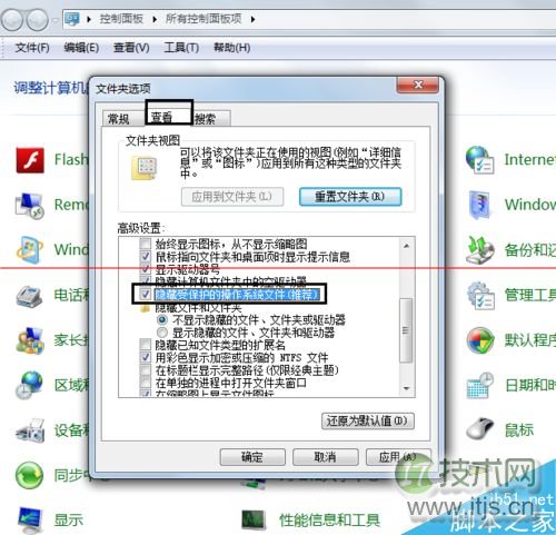 5、统还点选“查看”选项卡,程序找到“显示所有隐藏文件和文件夹”,打开去掉“隐藏受保护的系统文件”选项的点选。