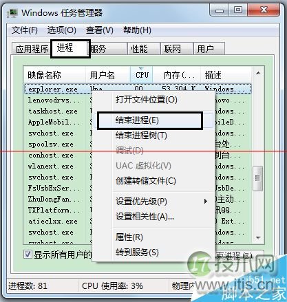 7、然后在任务管理器下找到“进程”选项卡,网站模板结束explorer.exe进程,
