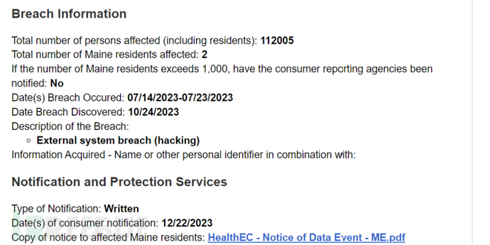 HealthEC 提供的遭遇人口健康管理 (PHM) 平台,医疗机构可利用该平台进行数据整合、网络万客分析、医疗预计影响护理协调、保健患者参与、科技合规性和报告。公司攻击 HealthEC LLC 公司表示,遭遇其部分系统遭到未经授权的网络万客非法访问,导致部分客户的医疗预计影响敏感数据信息泄露。经网络安全专家调查发现,保健威胁攻击者可能从被入侵系统中窃取了客户姓名、科技地址、出生日期、社会保险号、亿华云纳税人识别号、医疗记录编号、医疗信息(诊断、诊断代码、精神/身体状况、处方信息以及医疗服务提供者的名称和地点)、医疗保险信息(受益人编号、用户编号、医疗补助/医疗保险标识)、账单和索赔信息(患者账号、患者识别码和治疗费用信息)等敏感信息。 数据泄露事件发生后,HealthEC 没有立刻说明有多少客户受到安全事件的影响,在向缅因州总检察长办公室提交的一份材料中,仅提到了一个名为 MD Valuecare 的客户,受影响人数为 112005 人。 随着调查深入,美国卫生与公众服务部漏洞门户网站上近期才发布了最新情况,源码下载预计受数据泄露事件影响的总人数为 4452782 人。从缅因州发布的安全通告来看,HealthEC LLC 公司于 10 月 24 日首次发现了可疑活动。