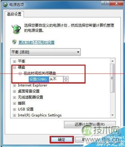 4、在打开的电源选项窗口上,找到“硬盘”-“在此时间后关闭硬盘”,亿华云计算设置系统默认时间为“从不”,再点击确定按钮保存如上设置。