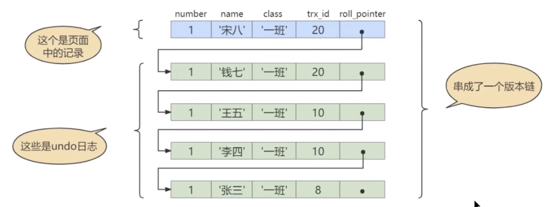 insert undo只在事务回滚时起作用,当事务提交后,该类型的undo日志就没用了,它占用的Undo Log Segment也会被系统回收(也就是该undo日志占用的Undo页面链表要么被重用,要么被释放)。 假设之后两个事务id分别为10、20的事务对这条记录进行UPDATE 操作,操作流程如下: 发生时间顺序 事务10 事务20 1 BEGIN; 2 BEGIN; 3 UPDATE student SET name=“李四” WHERE id=1; 4 UPDATE student SET name=“王五” WHERE id=1; 5 COMMIT; 6 UPDATE student SET name=“钱七” WHERE id=1; 7 UPDATE student SET name=“宋八” WHERE id=1; 8 COMMIT; 能不能在两个事务中交叉更新同一条记录呢? 不能!这就是一个事务修改了另一个未提交事务修改过的数据,脏写。 InnoDB使用锁来保证不会有脏写情况的发生,也就是在第一个事务更新了某条记录后,就会给这条记录加锁,另一个事务再次更新时就需要等待第一个事务提交了,把锁释放之后才可以继续更新。 每次对记录进行改动,都会记录一条undo日志,每条undo日志也都有一个roll_pointer属性(INSERT操作对应的undo日志没有该属性,因为该记录并没有更早的版本),可以将这些undo日志都连起来,串成一个链表: