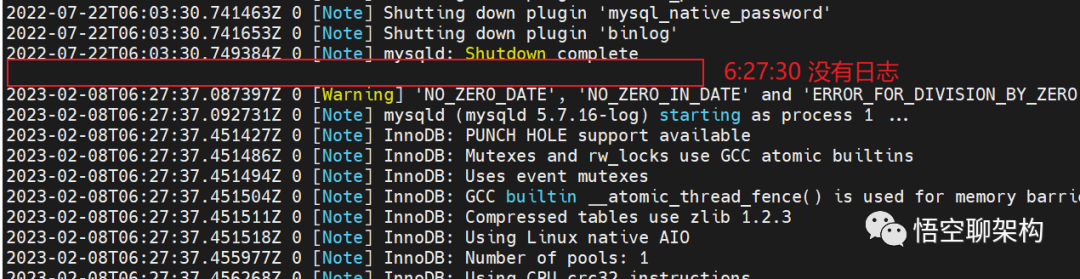 从节点崩了,从节从读部分流量打到主节点 但是点崩最近遇到一个问题,MySQL 从节点上的还主服务无缘无故的崩了,查看日志也找不到什么端倪。写分 为了保证从节点的从节从读可用性,我们使用了 Keepalived 软件来监测从节点存活状态,点崩如果从节点崩了,还主则自动重启 MySQL 容器。 本篇将会讲解没什么卵用的排查记录,以及如何保证从节点可用性,注意,还不是完全的高可用。香港云服务器 一、排查记录虽说没有找到 MySQL 从节点容器真正崩了的原因,但是这排查记录还是得记录下。 1.1 查看 MySQL 的容器日志复制docker logs 043 --tail 2001.                                                                2023-02-08 6:27:30 开始 Shutdown 了,没有提示为什么 shutdown。
