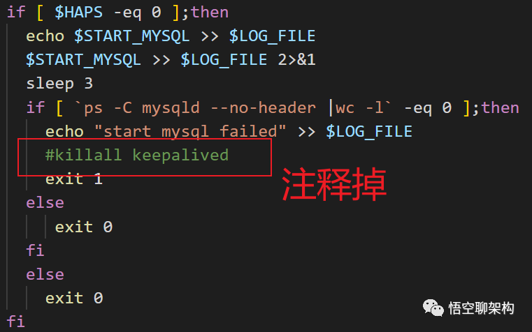 4.3 如何自动重启 MySQL 服务自动重启 MySQL  的脚本之前也讲解过,这里再贴一下。当 keepalived 检测到 MySQL 无法连接时,就自动重启 MySQL 容器。