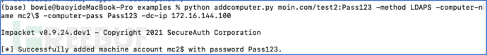 虽然UPN无法假冒,但是不代表dnsHostName不可以假冒。在MS-ADTS(3.1.1.5.1.3 唯一性约束)文档中并没有标识dnsHostName属性具有唯一性。实际上,通过下面的漏洞分析也可以发现实际这个属性可以重复,这也是这个漏洞产生的主要原因。 漏洞分析复现成功利用该漏洞需要满足以下几个必要条件: 攻击者获取到一个通过认证的普通域用户凭据或计算机账户凭据AD 域内已配置了 AD CS 服务Machine模板证书可以自动申请首先第一步需要获得一个已知凭据的计算机账户,如果没有可以使用普通账户通过Impacket创建一个新的计算机账户。