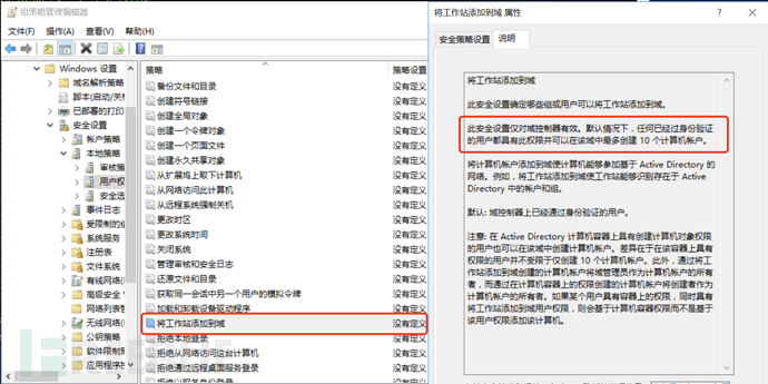 默认情况下每个普通用户都拥有添加10个机器账户的权限,添加机器权限可以通过编辑组策略控制,在Windows Server 2012以下版本的DC可以通过用户的属性 MS-DS-Machine-Account-Quota设置可添加计算机账户的数量。