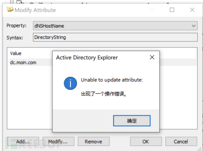 尝试直接修改机器的dnsHostName,提示出现操作错误(无法更新属性值),但是没有提示唯一性错误,云服务器因此可以猜测该值可以修改为DC的dnsHostName,但是出于某种限制,如值的类型不对或者是有某种对象的值依赖于该值导致无法成功更新修改到AD。
