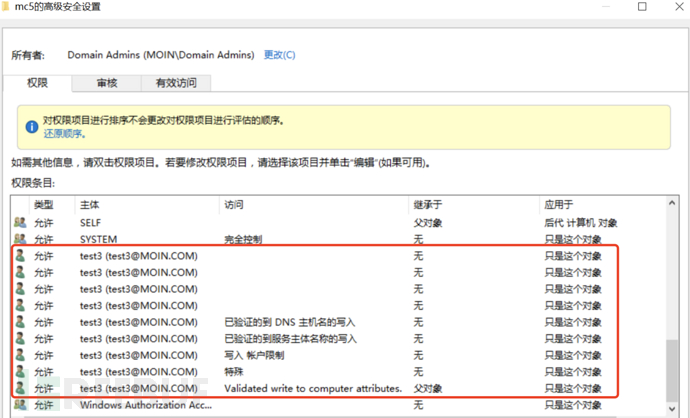 观察使用账户test3创建的主机,发现其ACL信息非常有意思。虽然是test3创建的计算机账户,但是机器账户的所有者却是Domain Admins账户。机器账户的中几条ACL信息非常有价值,分别是: 已验证的到DNS主机名的写入已验证的到服务主体名的写入已验证的到计算机属性的写入这证明创建计算机账户的用户账户是有计算机账户的dnsHostName、servicePrincipalName和其他属性的写权限,企商汇因此修改dnsHostName属性值在ACL权限上是可行的。