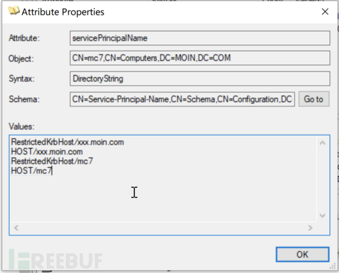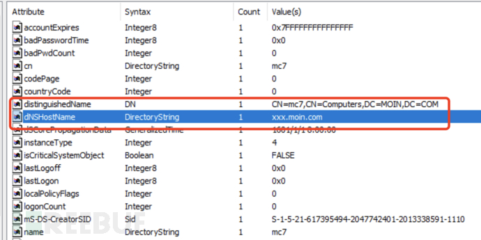 在将dnsHostName从mc7.moin.com修改为xxx.moin.com时,发现该计算机账户的servicePricipalName属性也发生了变化,其中的两个字段包含了新的dnsHostName。可以推测这个属性对dnsHost Name有依赖。