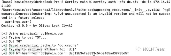使用该证书申请TGT,能够成功获取域控账户的NT Hash,说明证书有效。这说明成功的从普通域用户权限提升到了域控权限。