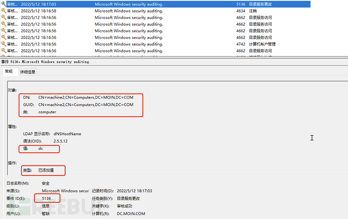 查看AD CS服务器中的证书申请记录,也可以看出AD CS认为认为颁发的证书为DC。   痕迹信息在进行修改dnsHostName值时,会在域控产生事件ID为5136的目录服务更改日志。其中的特征为将计算机对象的dNSHostName值修改为DC的名称。