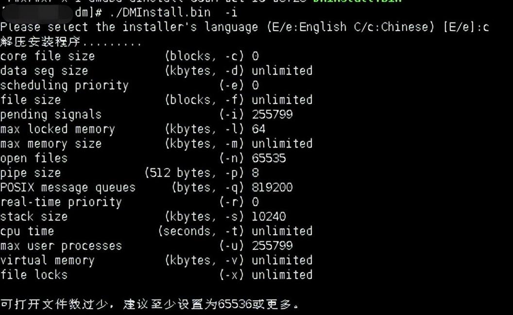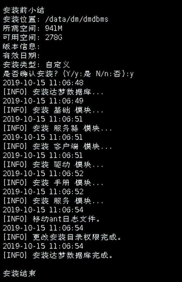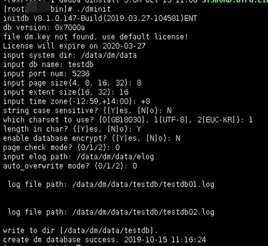 达梦数据库管理系统是国产达梦公司推出的具有完全自主知识产权的高性能数据库管理系统,简称DM。数据署初本次将进行DM8的库部开发版本的部署。 1、体验系统软硬件要求(1)硬件要求 达梦官方文档中给出的国产硬件要求如下:  (2)软件要求 软件环境的要求如下:  (3)环境检查 本次是在centos6上安装DM8的开发版,系统检测信息如下: 复制/** 操作系统版本*/ [root@DM33 ~]# cat /etc/redhat-release CentOS release 6.6 (Final) /** 操作系统位数 */ [root@DM33 ~]# getconf LONG_BIT 64 /** 操作系统名称*/ [root@DM33 ~]# uname -a Linux DM33 2.6.32-504.el6.x86_64 #1 SMP Wed Oct 15 04:27:16 UTC 2014 x86_64 x86_64 x86_64 GNU/Linux /** 内存信息 */ [root@DM33 ~]# free -gt total used free shared buffers cached Mem: 31 6 24 0 0 2 -/+ buffers/cache: 4 27 Swap: 15 0 15 Total: 47 6 401.2.3.4.5.6.7.8.9.10.11.12.13.14.15.16. 2、准备工作(1)创建用户 复制/** 创建安装用户组 */ groupadd dinstall /** 创建用户 */ useradd -g dinstall -m -d /home/dmdba -s /bin/bash dmdba1.2.3.4. (2)创建目录并上传安装包 复制/** 创建专属路径 */ mkdir -p /data/dm cd /data/dm /** 将下载的数据署初安装包上传至此路径 */ /** 创建软件目录及数据目录 */ mkdir data dbdbms /** 修改目录权限 */ chown -R dmdba:dinstall /data/dm /** 修改安装包的权限 */ chmod 775 DMInstall.bin1.2.3.4.5.6.7.8.9.10. 3、数据库系统软件安装(1)采用命令行方式安装 运行安装命令进行安装。库部  (2)选择是体验否输入key文件 本次为开发版本,忽略key输入:  (3)选择时区