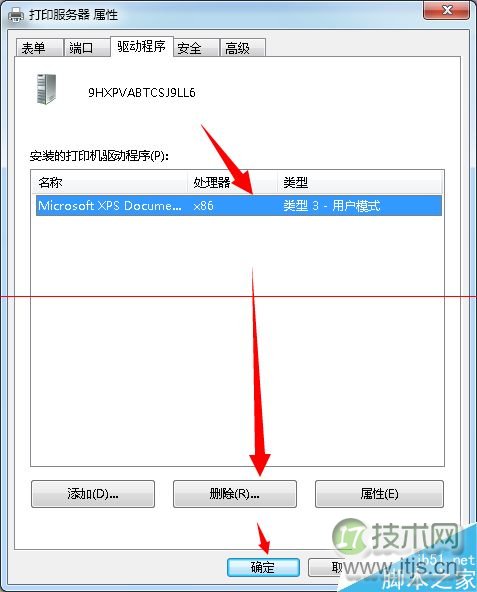 5、进入驱动程序界面后,站群服务器选中该打印机对应的驱动程序,然后选择“删除”,最后再确定。