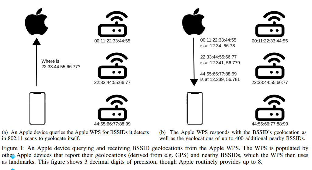 谷歌的WPS做前者,而苹果的WPS做后者。但研究人员表示,苹果的系统异常健谈。源码下载 “除了客户提交的BSSID的地理位置之外,苹果的API还机会主义地返回了所请求的BSSID附近多达数百个BSSID的地质位置,”该论文指出。 2.苹果开放的WPS研究方法被证明可以用于跟踪全球用户隐私该论文的合著者Erik Rye向the Register解释说,谷歌和苹果的WPS系统以根本不同的方式工作,由于其开放性,只有苹果的WPS提供了进行这项研究的方法。 Rye说:“在苹果的版本中,你可以向地理定位提交BSSID,它会返回它认为BSSID所在的地理位置。” “它还返回了更多(多达400个)你没有要求的附近的BSSID。这额外的400个对我们的研究非常重要,因为它们使我们能够在短时间内积累大量地理定位的BSSID,此外,苹果的免费信息发布网WPS不受身份验证或速率限制,可以免费使用。” 他说,谷歌的WPS只返回一个计算的位置,而且它还经过身份验证、有费率限制和付费,这使得它无法进行此类研究。 苹果系统的设计使Rye和Levin能够汇编一个包含全球4.9亿个BSSID的数据库,然后他们可以使用该数据库来跟踪个人和人群随时间的移动。  图片
