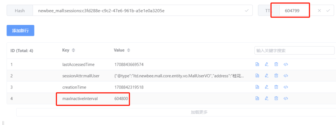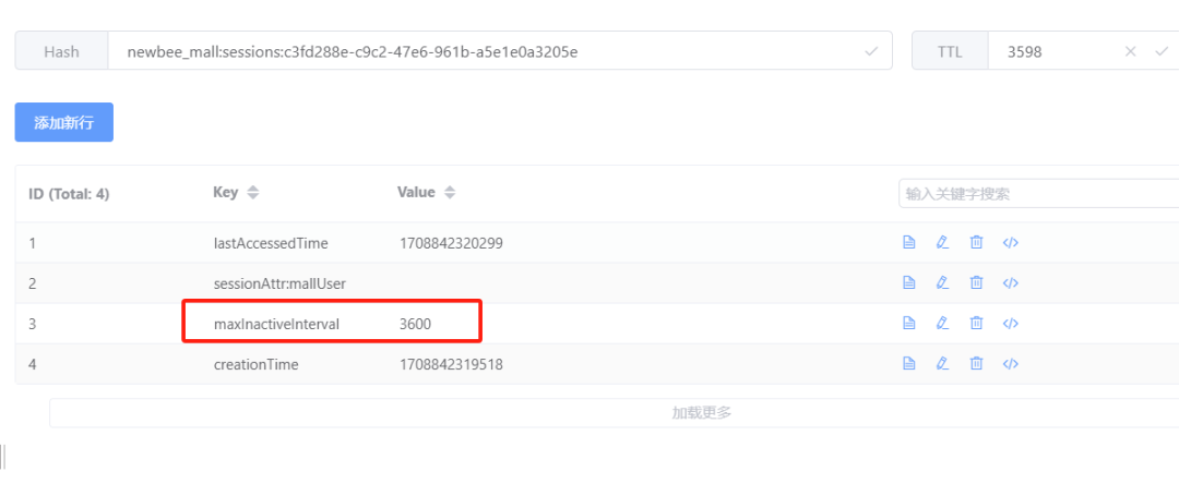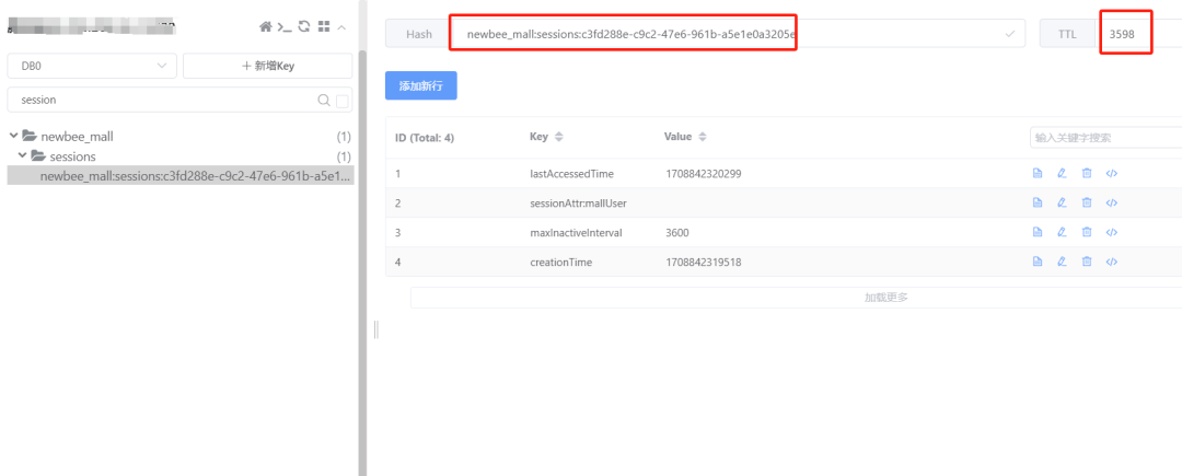 当用户打开 newbeepro 项目前端页面时,用户 session 就已经在 redis 中保存了下来,这一点我们通过查看 redis 客户端发现,此时用户的 session 信息已经存在,并且有效期是 3600 秒与我们 yml 配置的过期时间是一致的。  图片