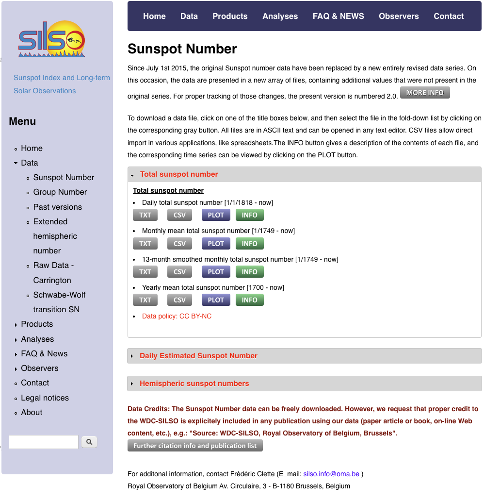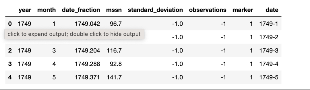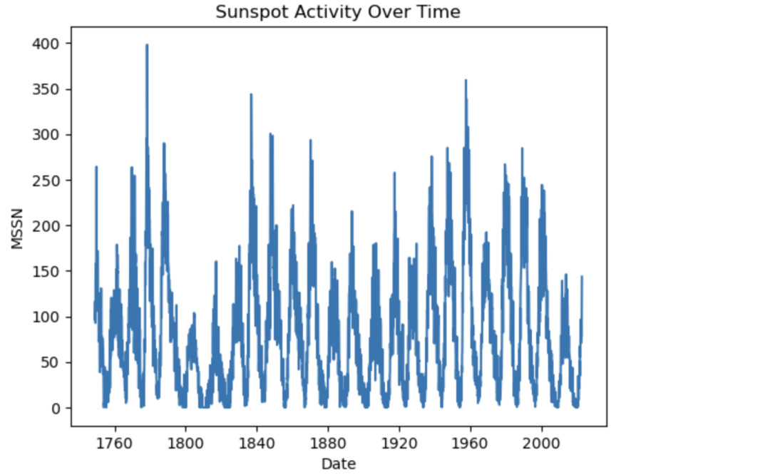 我们主要分析和探索:1749至2023年,月均太阳黑子数(monthly mean sunspot number,MSSN)变化情况。 二、数据导入将 MSSN 数据 csv 格式文件 SN_m_tot_V2.0.csv (https://www.sidc.be/silso/infosnmtot) 下载到本地。 以下是官方提供的 CSV 文件描述: 复制Filename: SN_m_tot_V2.0.csvFormat: Comma Separated values (adapted for import in spreadsheets ) The separator is the semicolon ; . Contents : Column 1-2: Gregorian calendar date- Year- MonthColumn 3: Date in fraction of year . Column 4: Monthly mean total sunspot number . Column 5: Monthly mean standard deviation of the input sunspot numbers . Column 6: Number of observations used to compute the monthly mean total sunspot number . Column 7: Definitive/provisional marker. 1 indicates that the value is definitive. 0 indicates that the value is still provisional.1.2.3.4.5.6.7.8.9.10.11.12. 我们使用 pandas 进行文件加载和预览: 复制import pandas as pddf = pd.read_csv("SN_m_tot_V2.0.csv", sep=";", header=None ) df.columns = ["year", "month", "date_fraction", "mssn", "standard_deviation", "observations", "marker" ] # convert year and month to stringsdf["year"] = df["year"].astype(str ) df["month"] = df["month"].astype(str ) # concatenate year and monthdf["date"] = df["year"] + "-" + df["month" ] df.head()1.2.3.4.5.6.7.8.9.  复制import matplotlib.pyplot as pltdf["Date"] = pd.to_datetime(df["date"], format="%Y-%m" ) plt.plot(df["Date"], df["mssn" ]) plt.xlabel("Date" ) plt.ylabel("MSSN" ) plt.title("Sunspot Activity Over Time" ) plt.show()1.2.3.4.5.6.7.