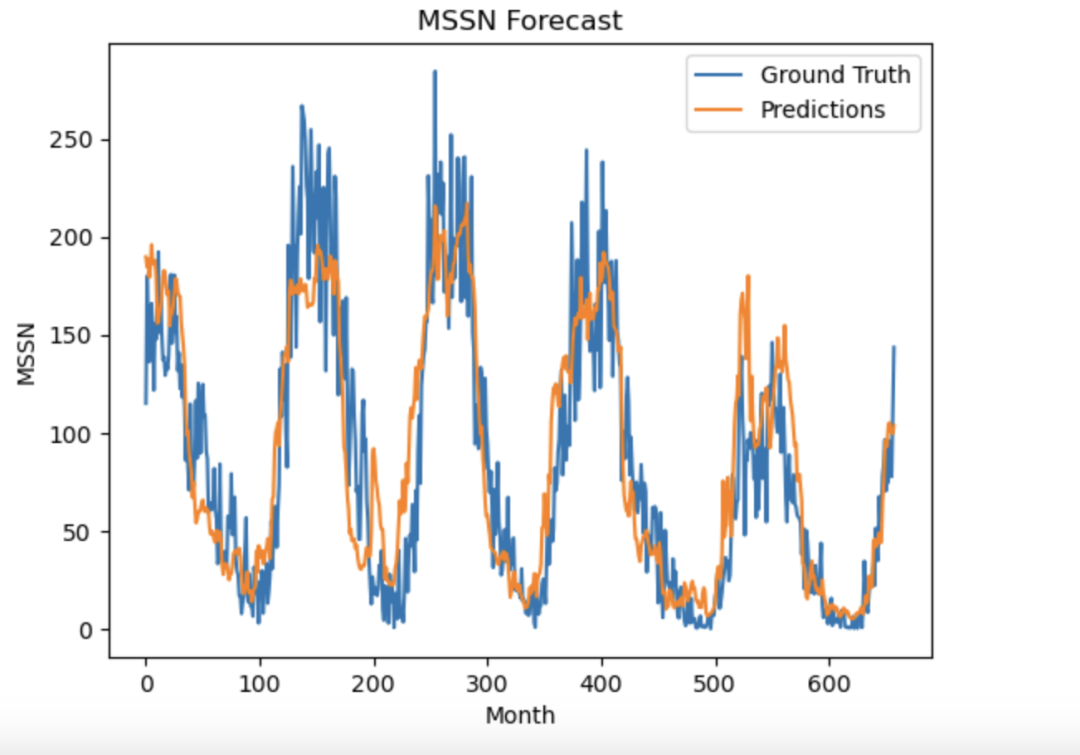 六、使用训练好的模型预测 MSSN复制def model_forecast(model, data, window_size ): ds = tf.data.Dataset.from_tensor_slices(data ) ds = ds.window(window_size, shift=1, drop_remainder=True ) ds = ds.flat_map(lambda w: w.batch(window_size )) ds = ds.batch(32).prefetch(1 ) forecast = model.predict(ds ) return forecastrnn_forecast = model_forecast(model, data[..., np.newaxis], WINDOW_SIZE ) rnn_forecast = rnn_forecast[split_index - WINDOW_SIZE:-1, -1, 0 ] # Overall Errorerror = tf.keras.metrics.mean_absolute_error(test_data, rnn_forecast).numpy () print(error)1.2.3.4.5.6.7.8.9.10.11.12. 复制101/101 [==============================] - 2s 18ms/step24.6764551.2. 七、与真实值对比的可视化结果复制plt.plot(test_data ) plt.plot(rnn_forecast ) plt.title(MSSN Forecast ) plt.ylabel(MSSN ) plt.xlabel(Month ) plt.legend([Ground Truth, Predictions], loc=upper right ) plt.show()1.2.3.4.5.6.7.  产品相关文档: 1. CnosDB快速上手指南: https://docs.cnosdb.com 2. CnosDB官网: https://www.cnosdb.com 3. CnosDB GitHub仓库: https://github.com/cnosdb/cnosdb 参考文献: 程术, 石耀霖, 张怀. 基于神经网络预测太阳黑子变化(2022) http://journal.ucas.ac.cn/CN/10.7523/j.ucas.2021.0068 今天的分享就到这里,谢谢大家。 站群服务器 |