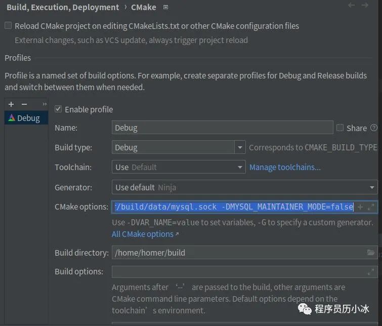 其中,有关 CMake Options 的部分参数如下所示: 复制-DWITH_BOOST=~/work/c++/mysql-8.0.28/boost -DCMAKE_BUILD_TYPE=Debug -DCMAKE_INSTALL_PREFIX=/home/homer/build -DMYSQL_DATADIR=/home/homer/build/data -DSYSCONFDIR=/home/homer/build -DMYSQL_UNIX_ADDR=/home/homer/build/data/mysql.sock -DMYSQL_MAINTAINER_MODE=false1.                                                                其中比较重要的有: DWITH_BOOST: 指定 boost 路径,可以直接指向源码文件夹下的boost文件夹;DCMAKE_BUILD_TYPE: 表示是debug,方便后续代码调试;DCMAKE_INSTALL_PREFIX:  表示编译状态的路径,选择源码文件夹之外的一个自建的build文件夹DMYSQL_DATADIR:表示MySQL默认的数据目录,选择build文件夹下的data文件然后执行命令进行编译,大概会花费数分钟的时间,并且可能会出现各类错误和问题。问题和错误会在本文后边进行记录。 Clion 调试如果Clion的CMake执行成功后,就会出现对应的 Run / Debug Configurations 选项,里边会有名称为mysqld的选项,它就是 MySQL Server 启动的选项。可以先用该选项执行 MySQL 数据目录的初始化操作,服务器托管生成对应的配置文件和用户名密码。然后再使用该选项来启动 MySQL Server。两个操作对应的参数不同。