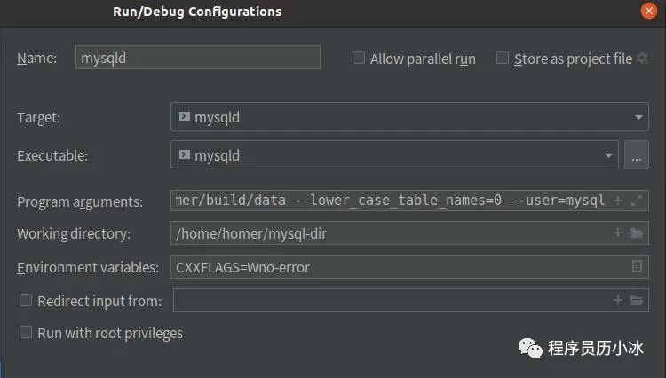 第一步初始化数据目录时,也需要先创建对应的用户。 复制# 创建 MySQL 用户组和 MySQL 用户 groupadd mysql useradd -r -g mysql -s /bin/false mysql1.2.3.                                                                                        然后使用 clion 的 mysqld 执行选项,输入的 Program arguments 如下所示: 复制--basedir=/home/homer/build --datadir=/home/homer/build/data --lower_case_table_names=0 --initialize-insecure --user=mysql1.                                                                其中 --initialize-insecure 表示非安全的初始化,可以设置无密码的用户。然后需要给对应的文件夹添加读写和执行权限。 复制chmod -R 777 /home/homer/build/data1.                                                                初始化后,就可以继续使用 clion 的 mysqld 执行选项来启动 MySQL了。输入的 Program arguments 如下所示: 复制--basedir=/home/homer/build --datadir=/home/homer/build/data --lower_case_table_names=0 --user=mysql1.