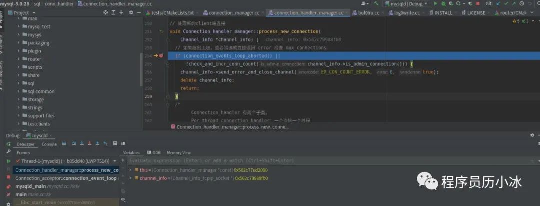 然后就可以看到我们在clion中设置断点的代码逻辑被拦截,下面我们就可以进行调试和代码阅读了。 问题记录在整个过程中,特别是编译阶段遇到了很多问题,这里也简单记录一下,相信不同的同学进行这个过程中都会遇到不同的企商汇问题,大家耐心解决。 1.default.cfg不存在编译时会有如下报错: 复制CMake Error: File /home/homer/work/c++/mysql-8.0.28/router/src/harness/tests/data/logger.d/default.cfg does not                            exist. CMake Error at router/cmake/testing.cmake:211 (CONFIGURE_FILE):1.2.                                                                                        可以在 cmake配置文件中找到如下片段,直接删除。 复制CONFIGURE_TEST_FILE_TEMPLATES(${CMAKE_CURRENT_SOURCE_DIR}/                            data "tests-good-1.cfg.in;tests-good-2.cfg.in;tests-start-1.cfg.in")SET(                            TEST_FILES logger.cfgmagic-alt.cfgtests-bad-1.cfgtests-bad-2.cfgtests-bad-3.cfg)1.2.3.4.5.6.7.8.9.                                                                                2.编译警告作为错误处理在编译过程中,发现编译器会把warning当做error处理,导致整个编译过程失败。具体报错如下所示。 复制cc1plus: all warnings being treated as errors1.                                                                经过搜索最终在 https://dev.mysql.com/doc/mysql-sourcebuild-excerpt/8.0/en/compilation-problems.html 文档中找到了对应的解决版本,需要将DMYSQL_MAINTAINER_MODE设置为false,否则就会导致编译器将warning作为error处理。 嵌入可以理解为一种组合或者代理模式的自动语法糖。 3.编译cache编译异常后,需要删除对应的 cmake cache 后再次进行编译,否则每次都会读取缓存进行相同的报错。  |