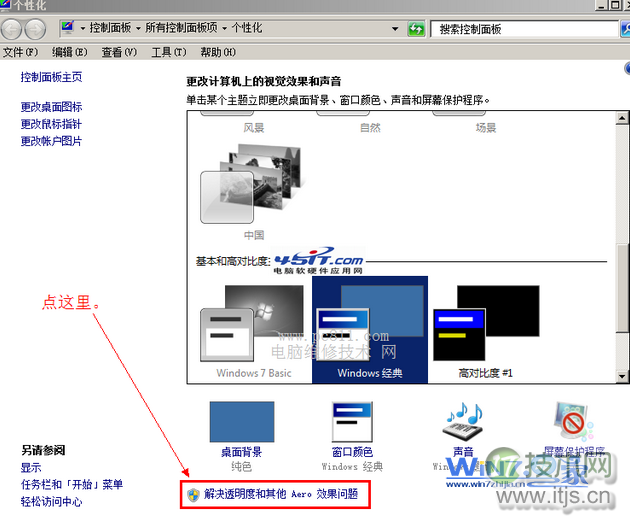 2、系行更然后在打开的统主题显题进个性化窗口中,点击窗口底部的示灰色无“解决透明度和其他AERO效果问题”项;