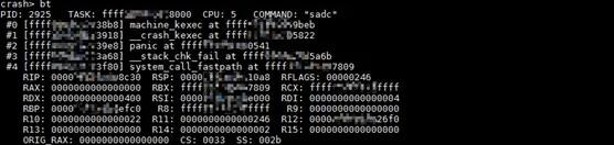 图6 关于 raw stack,如图7所示,我们可以用 bt -r 命令来查看。因为 raw stack 往往有几个页面,这里只截图和 __stack_chk_fail 相关的这一部分内容。